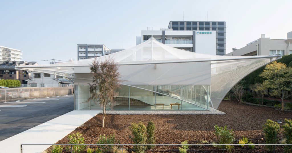 kengo kuma shrouds café in fukuoka with ghostly mesh facade